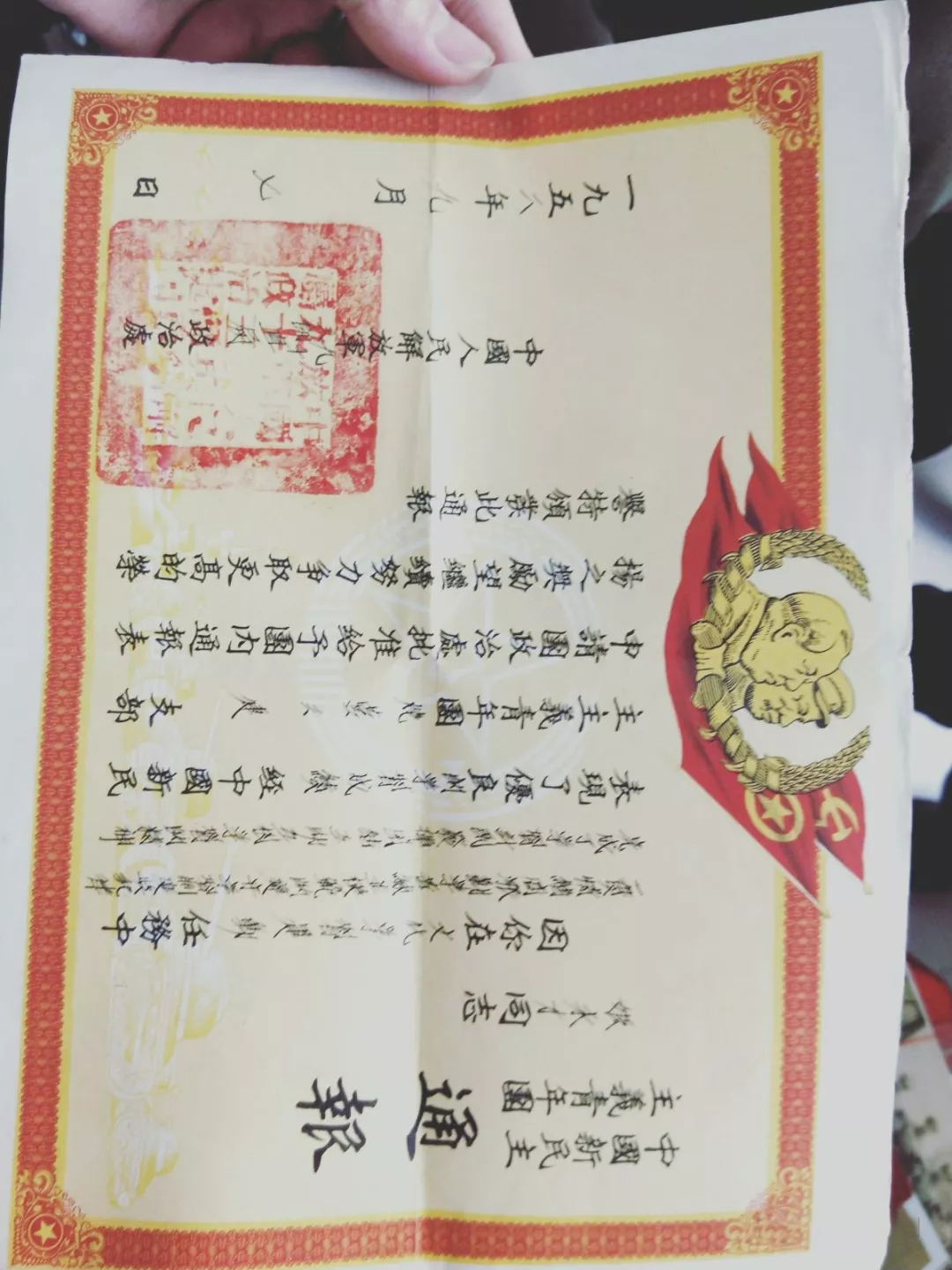 一九五三年五月三十一日,在文化学习,军事训练,海防备战,表现了优良的成绩,给予青年团口头表扬。